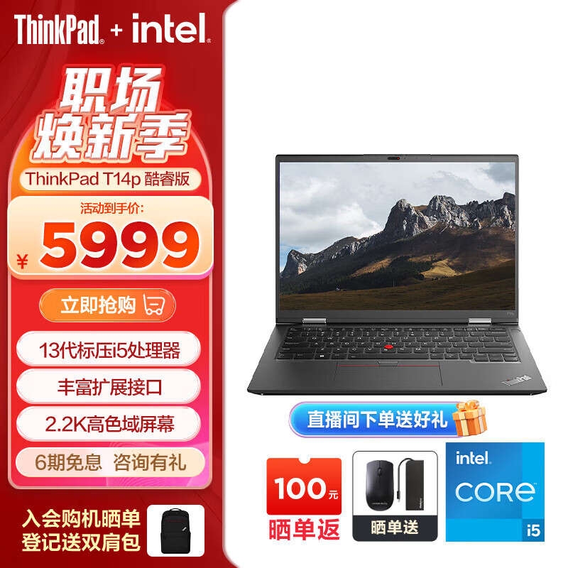 ThinkPad T14p 联想 13代英特尔酷睿标压 T系列工程师商务办公高性能笔记本电脑 14英寸轻薄本2.2K高色域屏 i5-13500H 16GB 512GB 00CD价格:5999.00元!