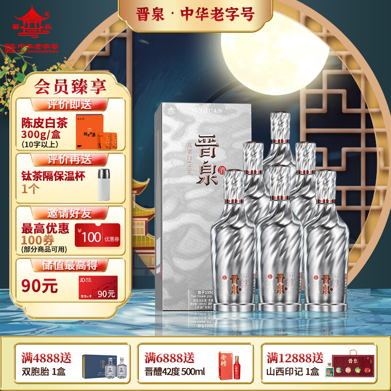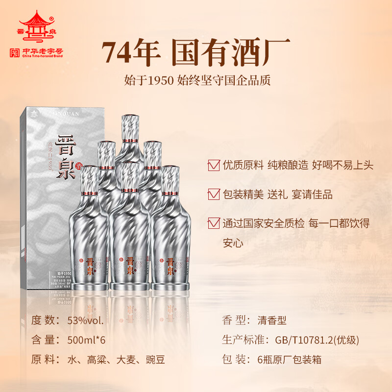 晋泉1950+ 高粱白酒 清香型白酒 53度 500ml*6瓶 整箱装价格:1288.00元!