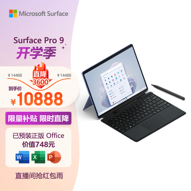 微软Surface Pro 9 宝石蓝+典雅黑带触控笔键盘盖i7 16G+256G 二合一学生平板13英寸120Hz触控屏笔记本价格:10888.00元!