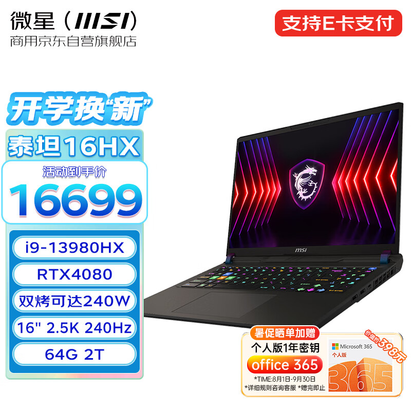 微星(MSI)泰坦16HX 酷睿i9 16英寸设计剪辑办公笔记本电脑(i9-13980HX 64G 2T RTX4080 2.5K 240Hz)定制价格:16699.00元!