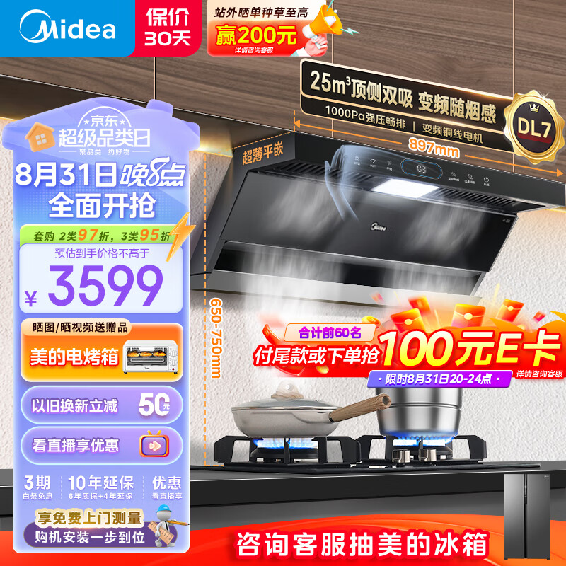 美的(Midea)抽油烟机燃气灶具家用顶侧双吸25风量大吸力变频烟感 7字型排烟机烟灶套装DL7+Q70A天然气价格:3599.00元!