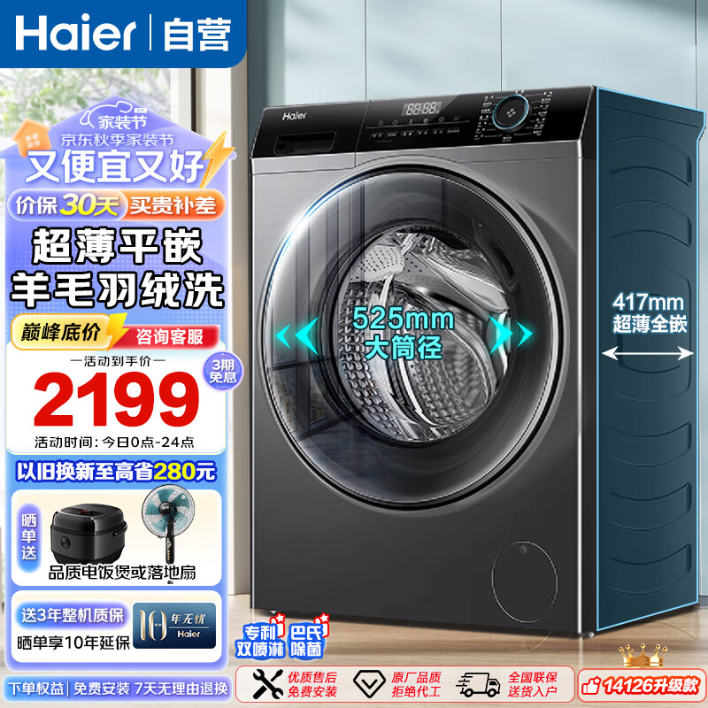 海尔(Haier)全自动滚筒洗衣机8KG大容量超薄平嵌变频羊毛羽绒洗 大筒径筒自洁巴氏除菌螨 14126升级款MATE33s价格:2198.00元!