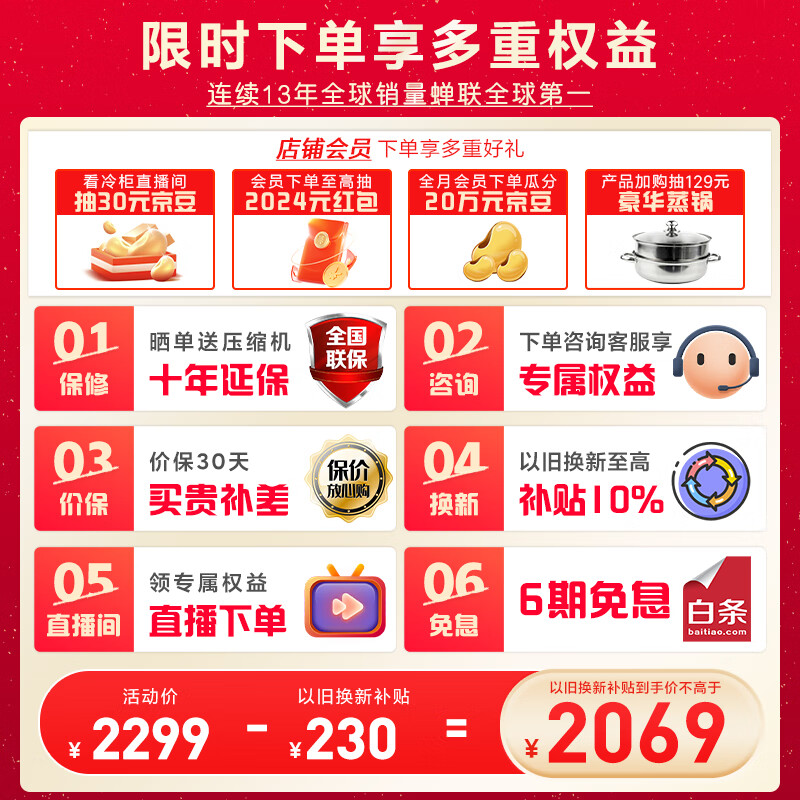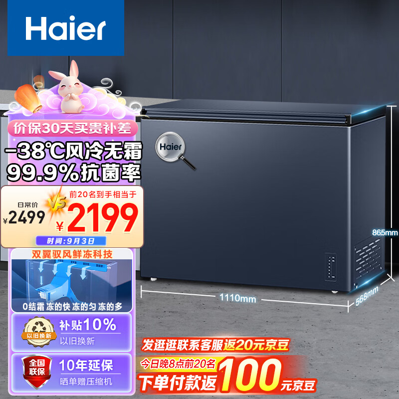 海尔(Haier)242升风冷无霜冰柜家用商用一级能效省电保鲜全冷冻卧式冷柜-38°深冷BC/BD-242WGHED以旧换新价格:2299.00元!