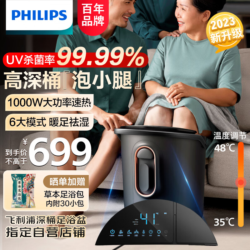 飞利浦(PHILIPS)泡脚桶 UV杀菌泡脚盆加热自动按摩深桶足浴盆多模式智能洗脚盆 圣诞礼物生日礼物送父母长辈 5302F价格:799.00元!