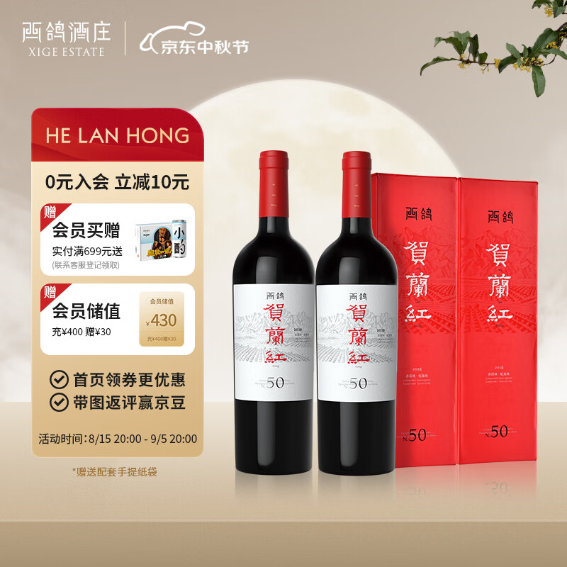 贺兰红西鸽N50干红葡萄酒750ml*2瓶礼盒装 宁夏贺兰山国产红酒中秋送礼价格:768.00元!