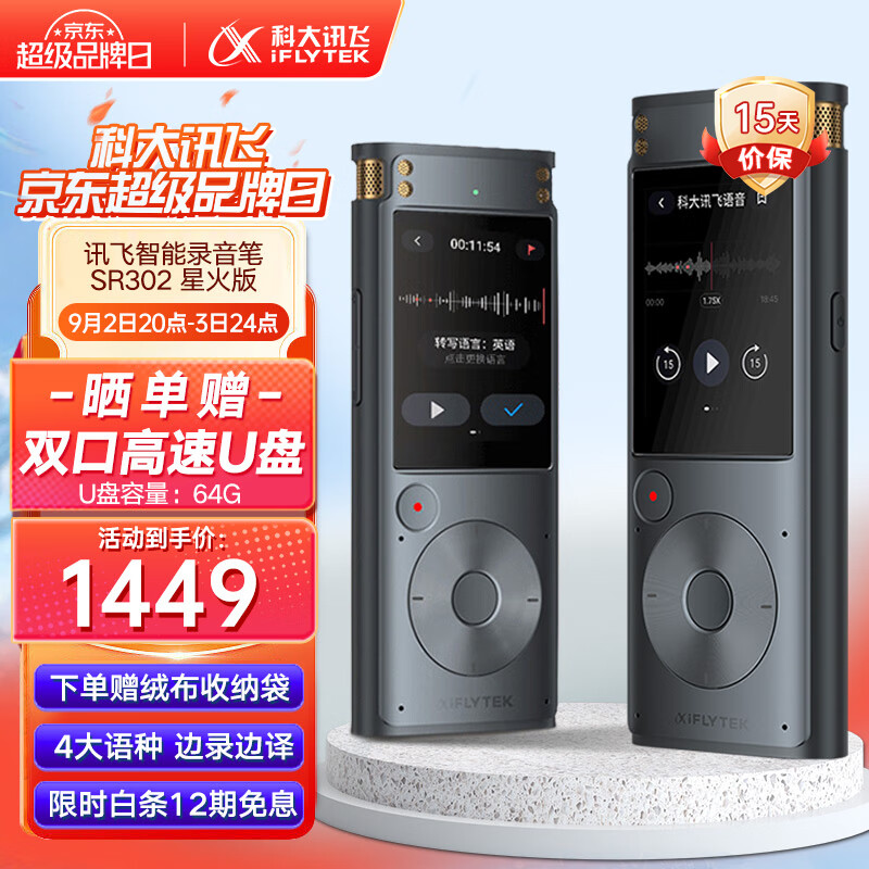 科大讯飞智能录音笔SR302星火版 免费录音转文字 智能降噪录音神器 随身便携专业录音设备录音机 同声传译价格:1499.00元!