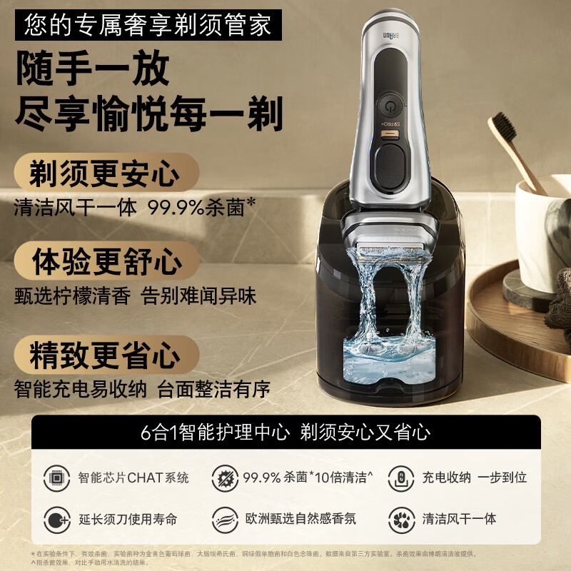 4、之前用的博朗6系没有清洗配件,当时也没有买充电舱配件。这次活动力度非常大,就入手了这款顶配的九系pro+,以及充电舱和清洗配件。非常划算