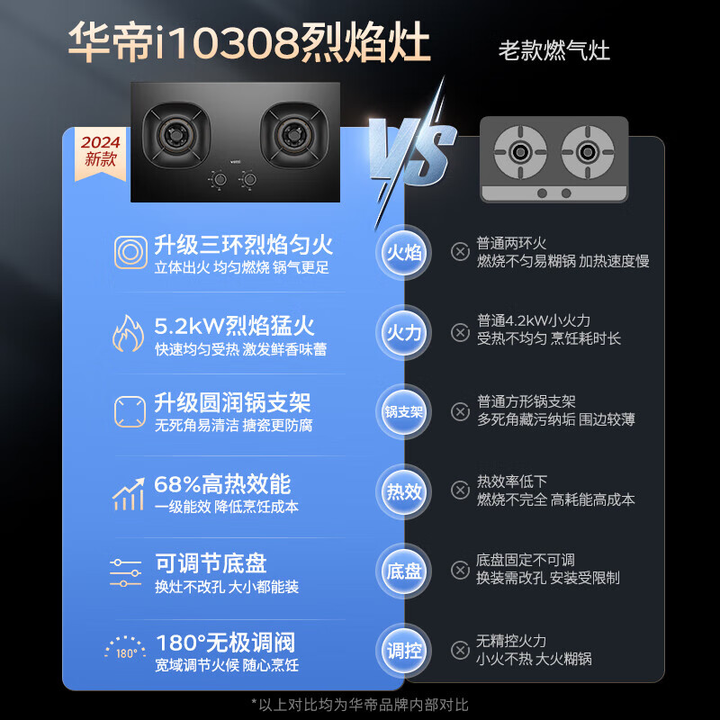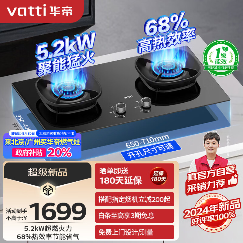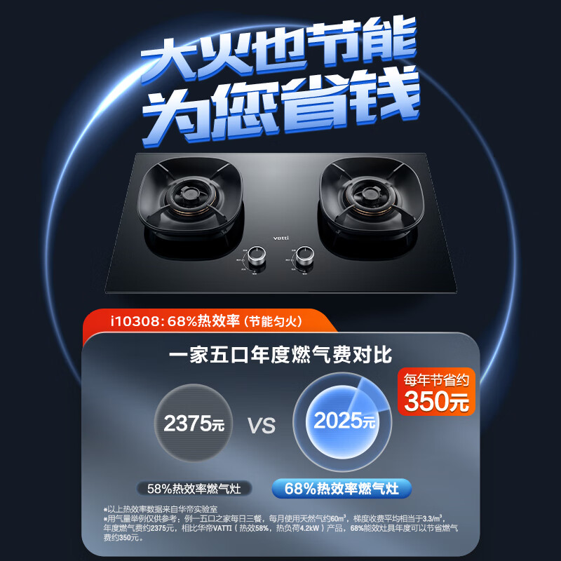 华帝(VATTI)官方家用燃气灶天然气灶双灶嵌入式5.2kW大火力猛火灶一级能效煤气灶双灶灶具灶台JZT-i10308价格:2099.00元!