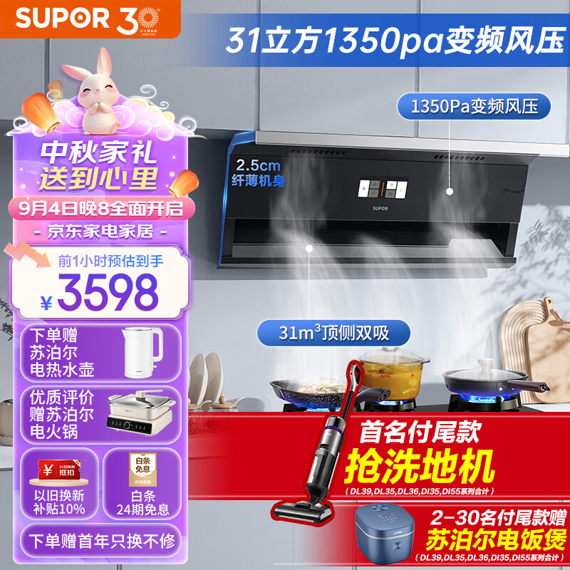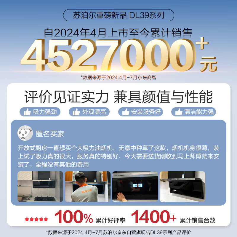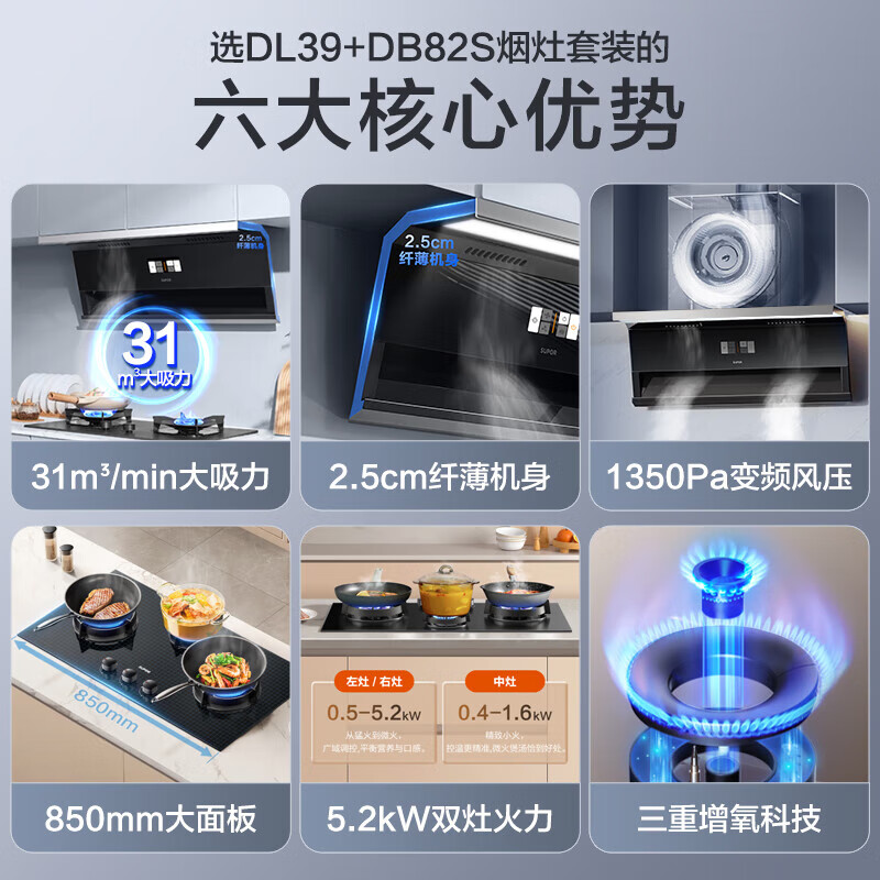 苏泊尔(SUPOR) 顶侧双吸变频1350pa风压烟灶套装 31立方大吸力烟灶套装 家用油烟机燃气灶套装 DL39+DB82S天价格:3698.00元!