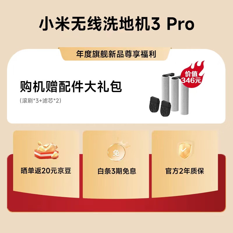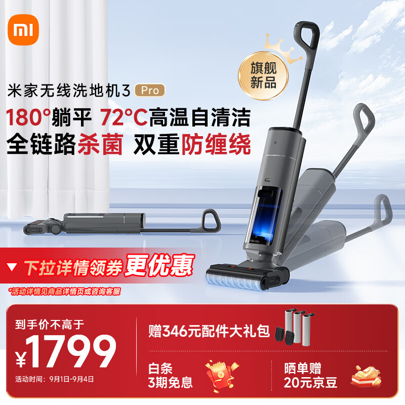 米家小米无线洗地机3Pro 扫地吸拖一体180°躺平全链杀菌 高温热洗热烘自清洁 手持吸尘防缠绕洗地机价格:1799.00元!