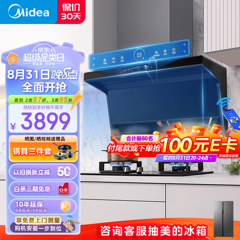 美的(Midea)抽油烟机 燃气灶具 家用顶侧双吸大吸力 高压水洗 变频排烟机 新静吸烟灶套装DC7+Q330天然气价格:3899.00元!