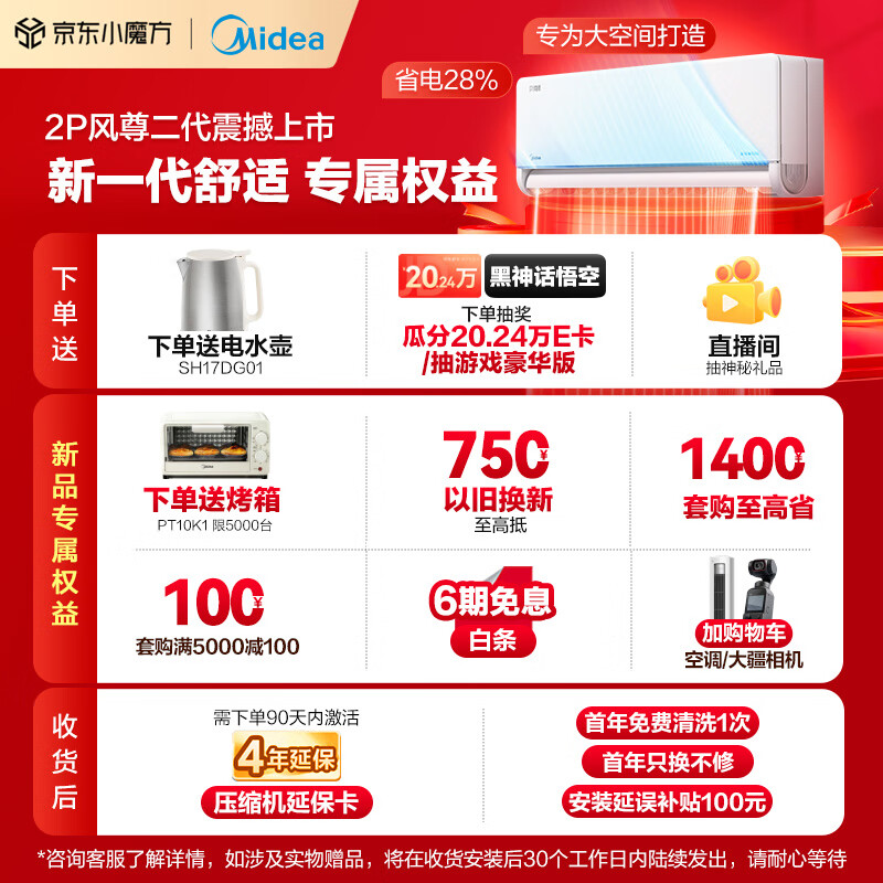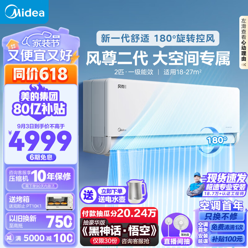 美的(Midea)2匹 风尊二代 新一代舒适空调 一级能效变频冷暖壁挂式挂机除湿智能家电 KFR-46GW/N8MXC1Ⅱ价格:4999.00元!