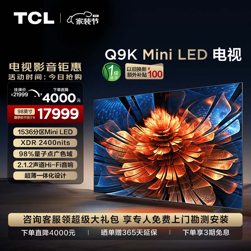 TCL电视 98Q9K 98英寸 Mini LED 1536分区 XDR 2400nits QLED量子点 超薄 北京以旧换新一级能效100价格:17499.00元!