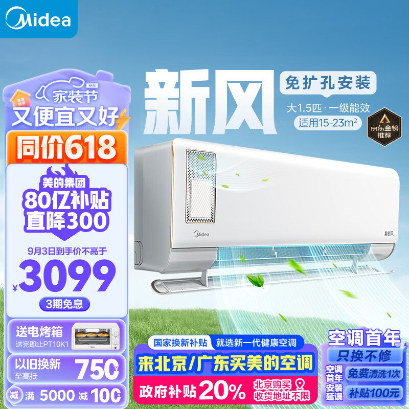 美的(Midea)新风空调 大1.5匹 静新风 新一级能效 变频冷暖除湿 壁挂式空调挂机 KFR-35GW/N8XF1-1定制版价格:3099.00元!