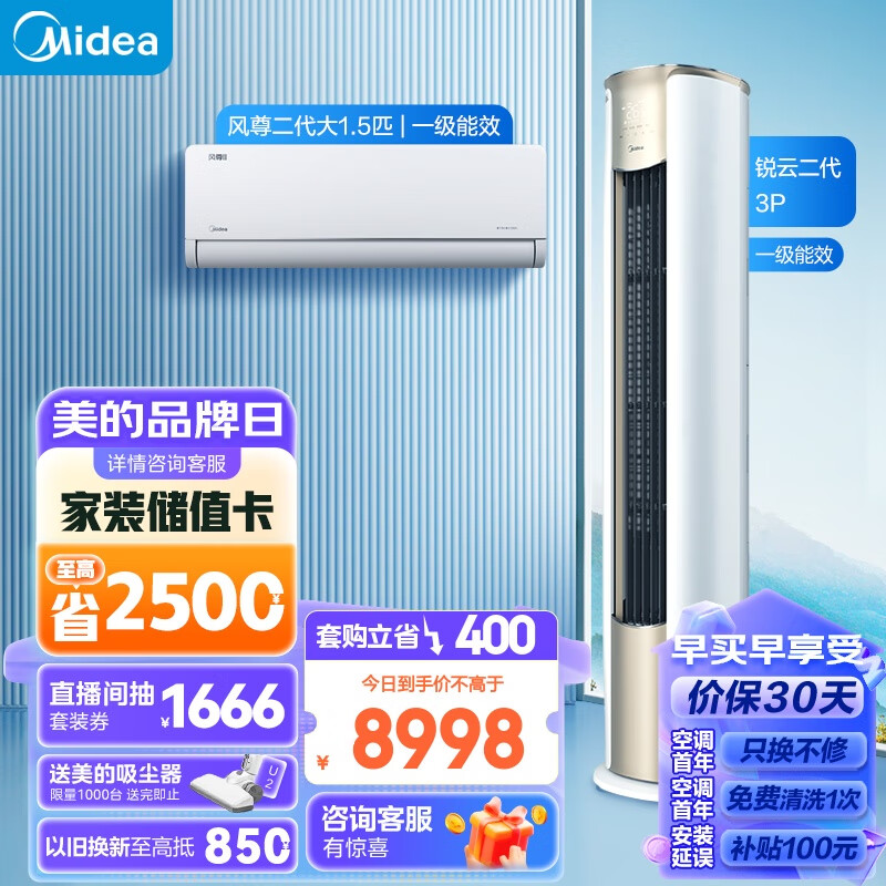 美的(Midea)空调风尊系列小户型精选 一室一厅套装(大1.5匹风尊二代一级+3匹锐云二代柜机一级)一站购齐套购价格:9398.00元!