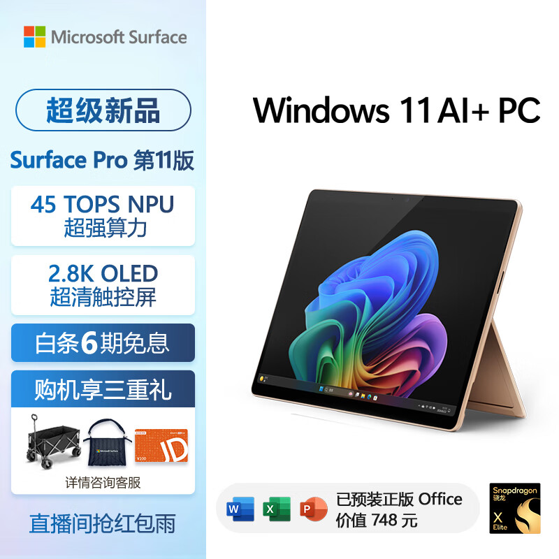 微软(Microsoft)全新Surface Pro第11版 骁龙X Elite 16G 512G 沙漫金二合一平板笔记本电脑 学生平板 AIPC Pro 11价格:11088.00元!