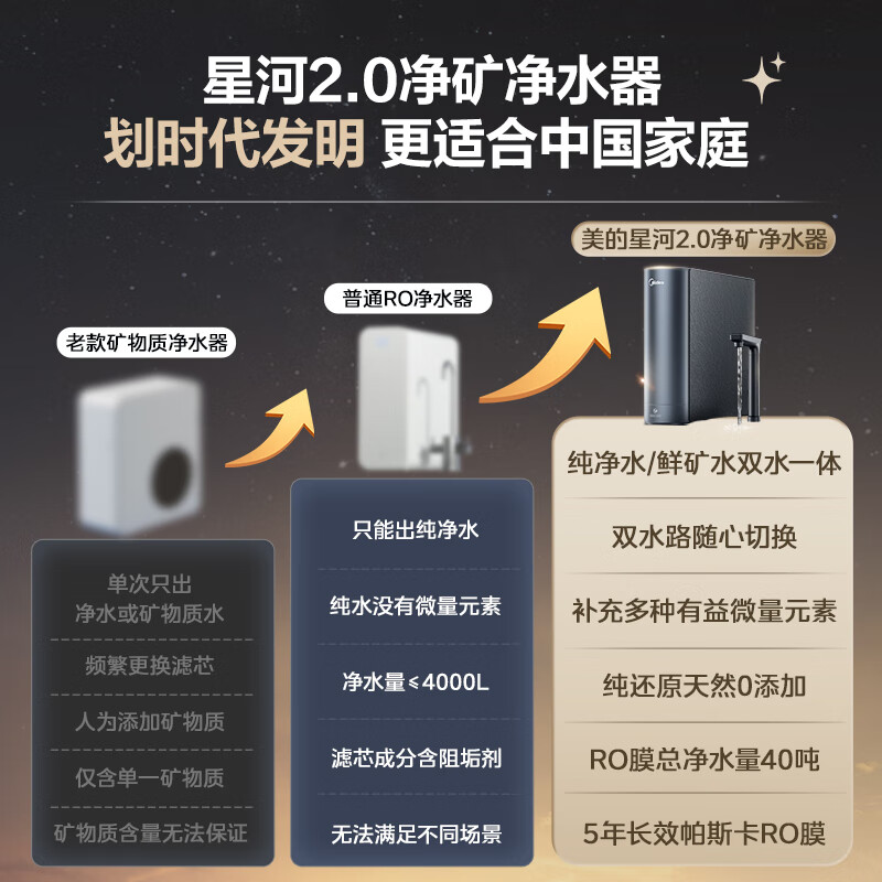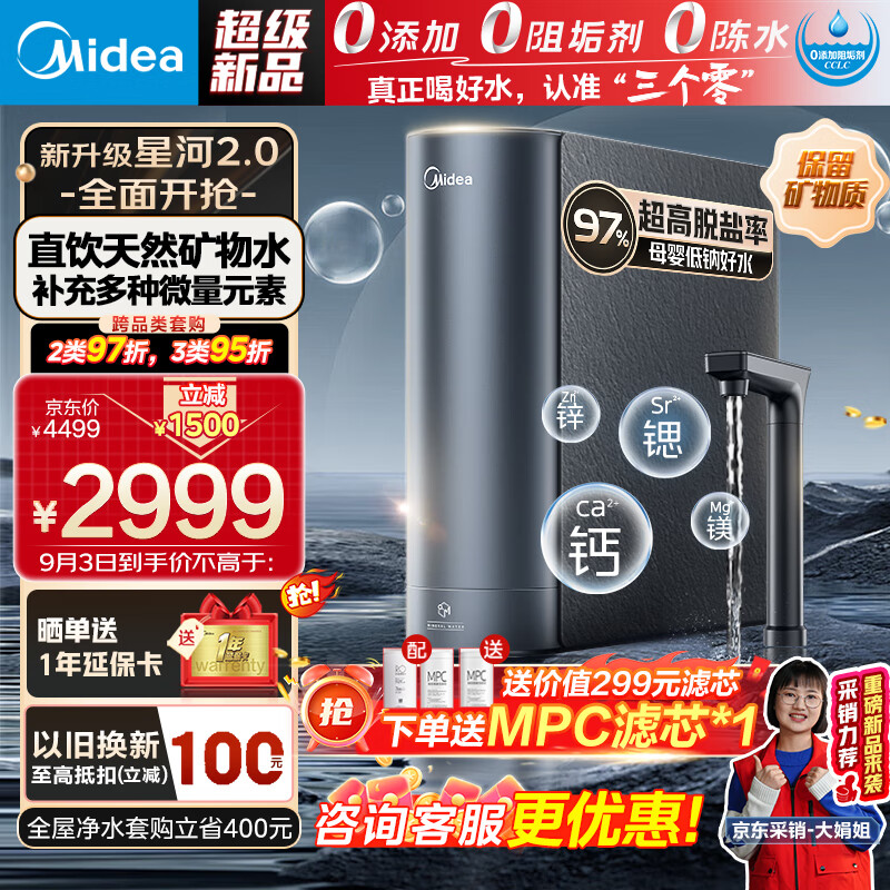 美的(Midea)家用净水机 星河2.0净矿净水器双水机1000G 5年长效RO反渗透矿物质净水器厨下式直饮机 2.72L/分价格:2999.00元!