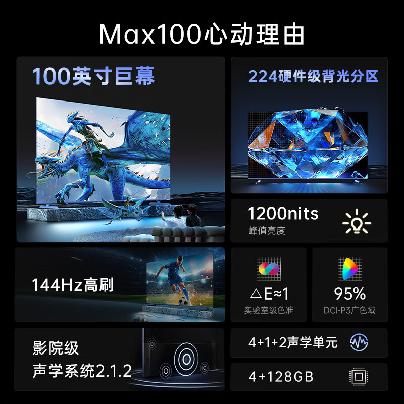 3、创维酷开100max效果显示太棒了。高刷新率看4k超高清视频非常流畅,不晕旋。自带的播放系统可以去掉广告,支持usb安装Android软件。连上小主机或者switch玩大型游戏也非常震撼。支持杜比音效,可以少买一个回音壁。非常愉快的购物,安装师傅认真负责。