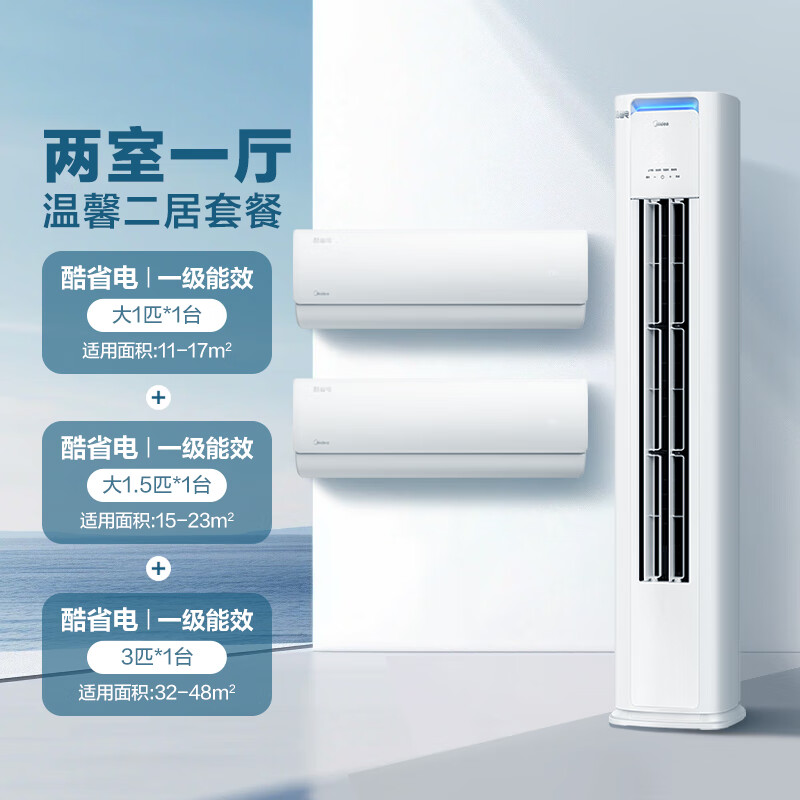 美的(Midea)空调 新一级能效 酷省电 空调套装 两室一厅 温馨二居套餐(大1匹+大1.5匹+3匹)价格:11697.00元!