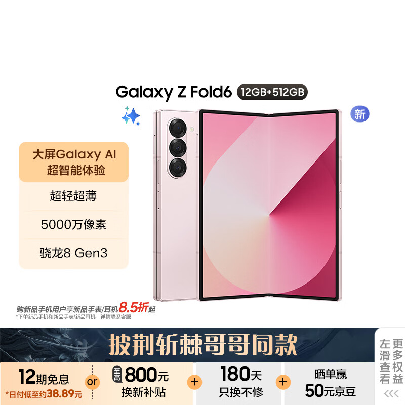 三星(SAMSUNG)Galaxy Z Fold6 大屏AI手机 超轻薄折叠屏手机 披荆斩棘哥哥同款 游戏手机 12GB+512GB 浅玫粉价格:13999.00元!