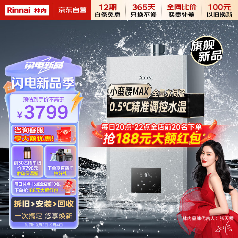 林内(Rinnai)【小蛮腰Max】13L燃气热水器 水伺服恒温 0.5℃调温 变频节能热水器 13GD72(JSQ26-GD72)以旧换新价格:3799.00元!