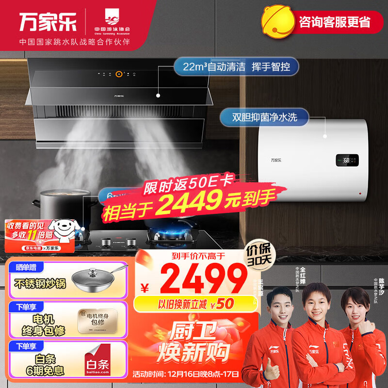 万家乐烟灶热水器套装 22立方挥手烟灶50L扁桶WIFI智控电热水器多件套装AL061+KV061B+50FB0天然气价格:2799.00元!