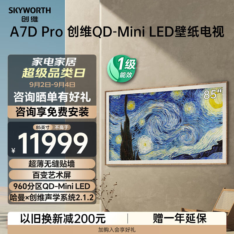 创维壁纸电视85A7D Pro 85英寸 超薄壁画艺术电视机 无缝贴墙 960分区量子点Mini LED巨幕大屏价格:11999.00元!