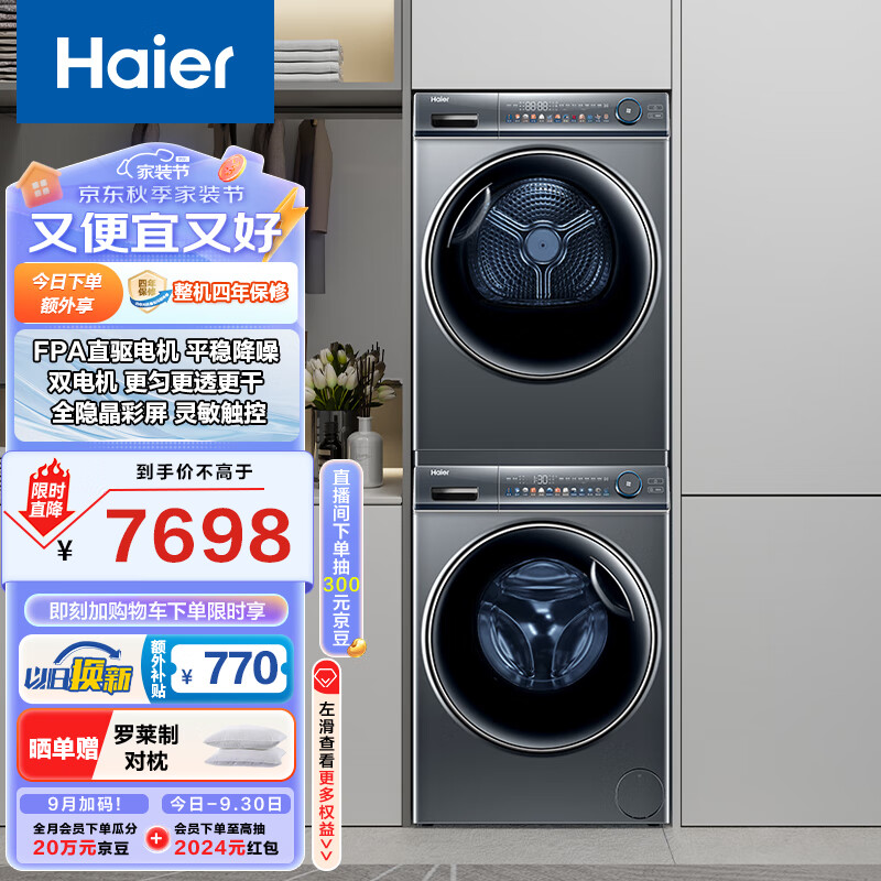 海尔(Haier)81平嵌洗烘套装 10KG滚筒洗衣机全自动+双擎热泵烘干机家用组合 全隐晶彩屏 MATE81+81 以旧换新价格:7698.00元!