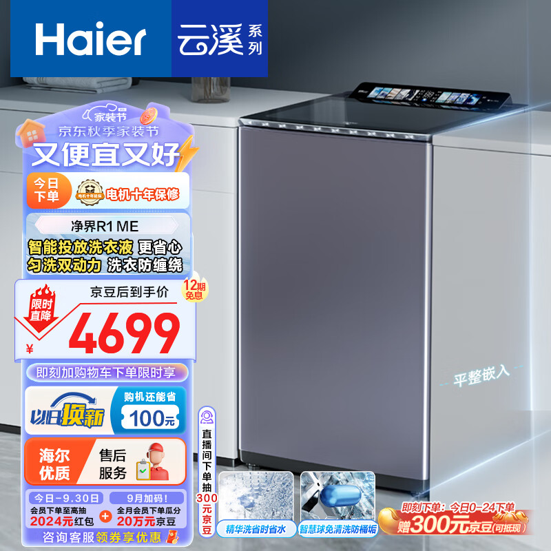 海尔(Haier)云溪波轮洗衣机全自动家用【净界R1·ME】10公斤后控平嵌 精华洗 免清洗 双动力防缠绕MS100-BZ568H价格:4999.00元!