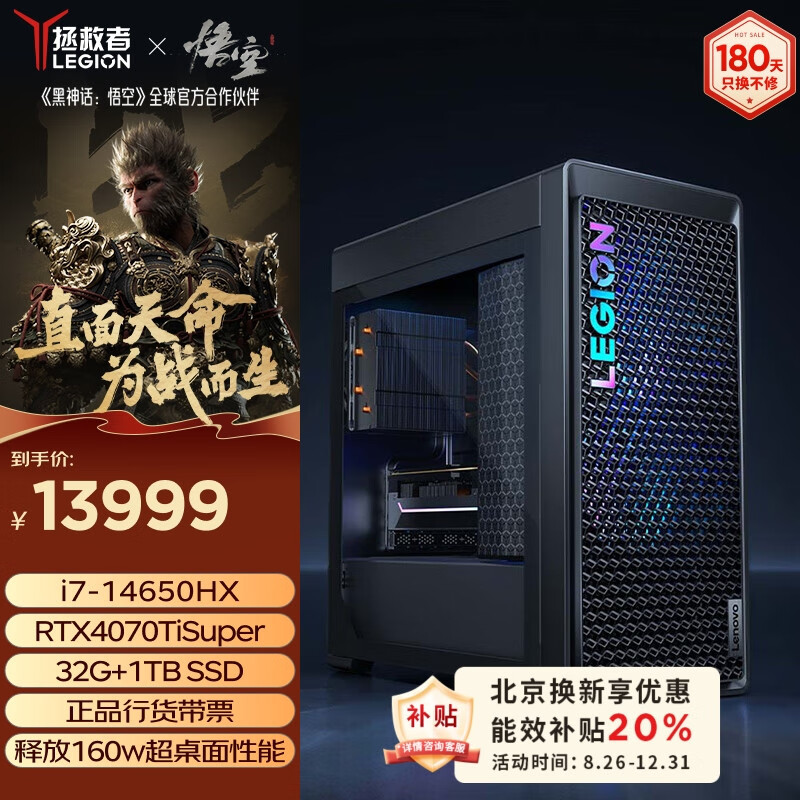 联想(Lenovo)拯救者刃7000K游戏主机官方合作台式电脑14代i7-14650HX RTX4070TiSuper 32G价格:13999.00元!