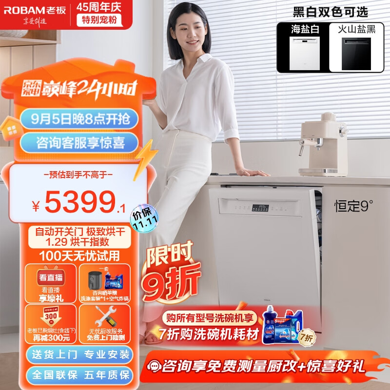 老板(Robam)盐系G1海盐白17+1套三层大容量嵌入式洗碗机自动开关门独立热风烘干独立紫外消毒免费橱改W76A-G1价格:5998.00元!