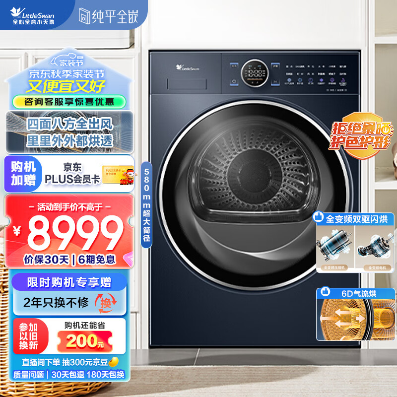 小天鹅(LittleSwan)10公斤热泵烘干机 变频干衣机家用 纯平全嵌 多重毛屑过滤 6D气流烘 TH100VH89PRO价格:8999.00元!