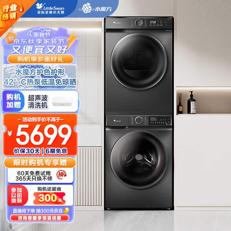 小天鹅(LittleSwan)水魔方洗烘套装 10公斤滚筒洗衣机+热泵烘干机 除菌除螨除潮 干湿除毛 TG100V618T+02价格:5599.00元!