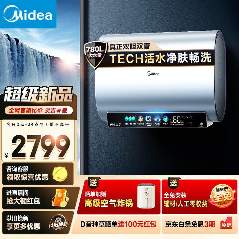 美的(Midea)60升TECH活水玲珑超薄 双胆扁桶电热水器免清洗3300W水电分离一级能效F6033-UD7Pro(HE)速热价格:3099.00元!