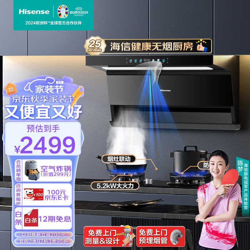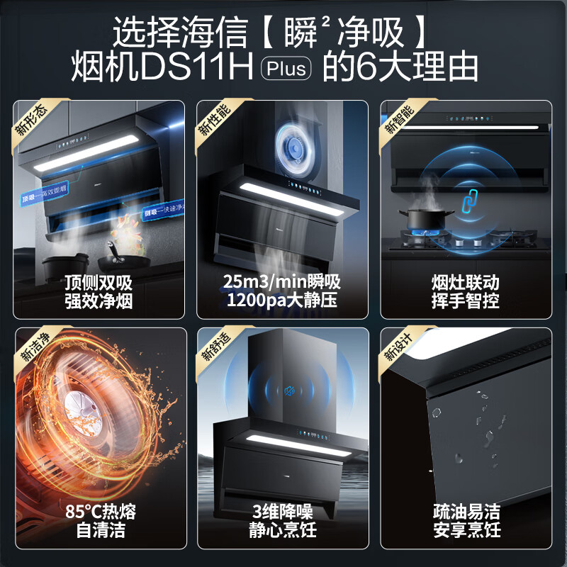 海信(Hisense)抽油烟机 超薄平嵌顶侧双吸变频25立方大吸力1200Pa静压烟灶联动5.2kW防干烧烟灶套装DS11HPlus+A1价格:2999.00元!