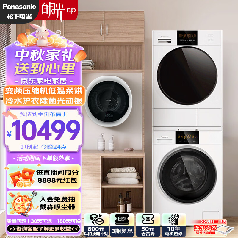 松下(Panasonic)白月光2.0+小漩风 10kg滚筒洗衣机+变频热泵烘干机 家用母婴壁挂单洗 CP套装 3E1AK+EH1015+A500W价格:10499.00元!