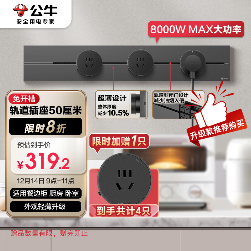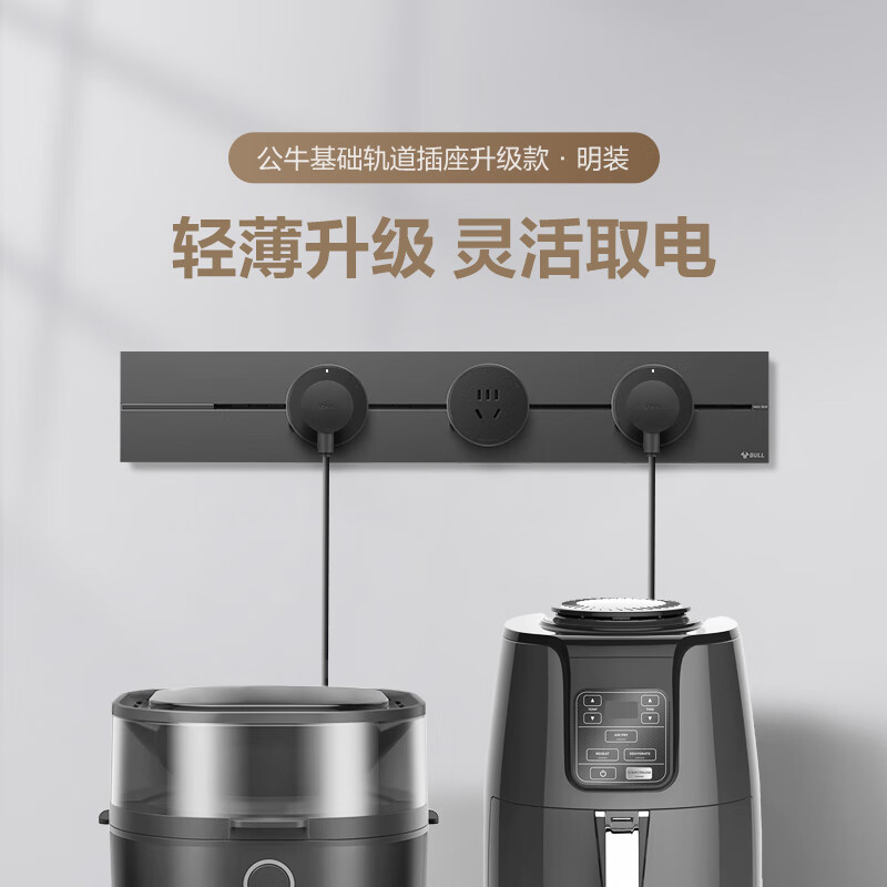 公牛(BULL)明装 轨道插座 大师轻薄款 可移动墙壁插座壁挂式滑轨插座 免打孔 50厘米轨道+3个五孔 墨云灰价格:399.00元!