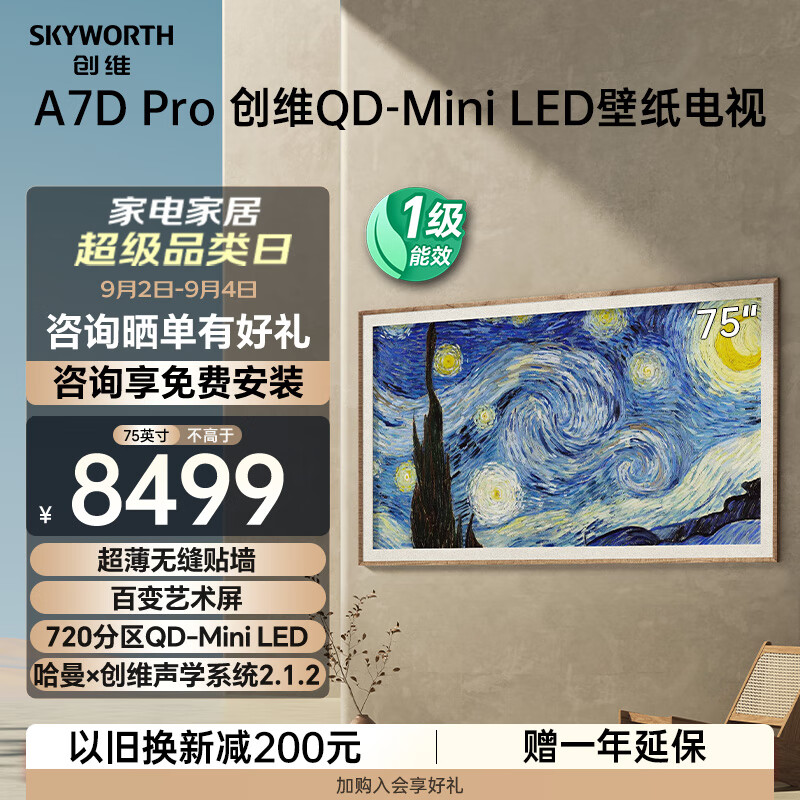 创维壁纸电视75A7D Pro 75英寸超薄壁画艺术电视机 无缝贴墙 720分区量子点Mini LED液晶电视价格:8499.00元!