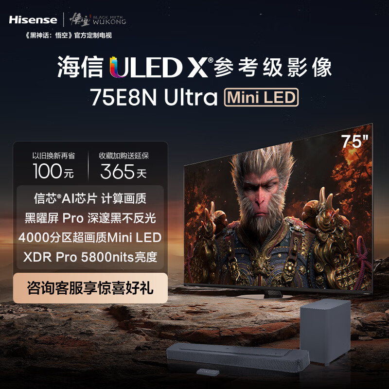 海信ULED超画质电视75E8N Ultra+Bar500沉浸追剧套装 75英寸 ULED X Mini LED 液晶平板电视机价格:16298.00元!