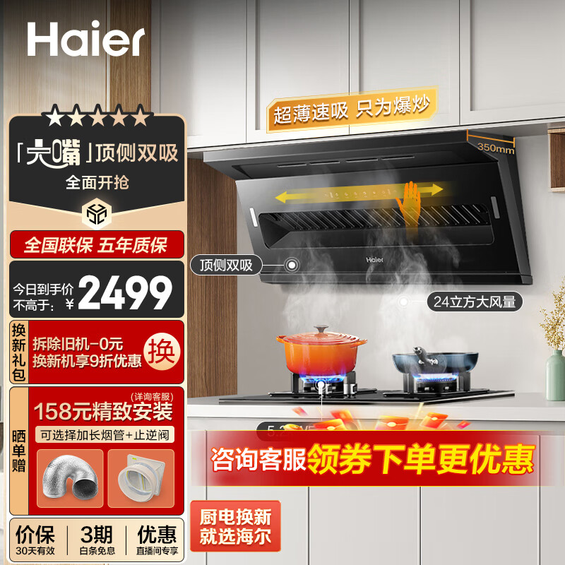 海尔(Haier)抽油烟机顶侧双吸 24m3/min大吸力 挥手智控 7字型家用厨房吸油烟机套装 齐平橱柜C51+Q2BE7天价格:2499.00元!