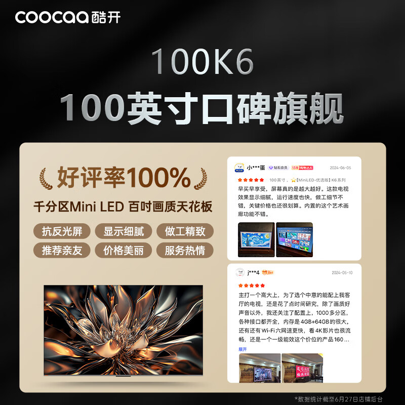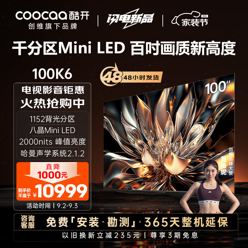 酷开创维100K6 100英寸 Mini LED 2000nits 1152分区 4K 144Hz 哈曼调音一级能效液晶游戏电视机100P6E价格:10999.00元!