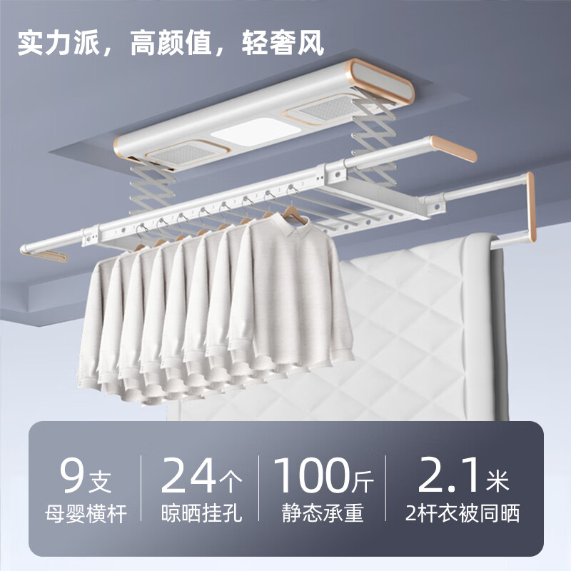 5、这款晾衣架真的性价比挺高的,挺喜欢的,智能解放双手,用着也很方便,也挺灵敏的,整体外观也挺好看的,手柄和语音控制都很不错,家人也很喜欢
