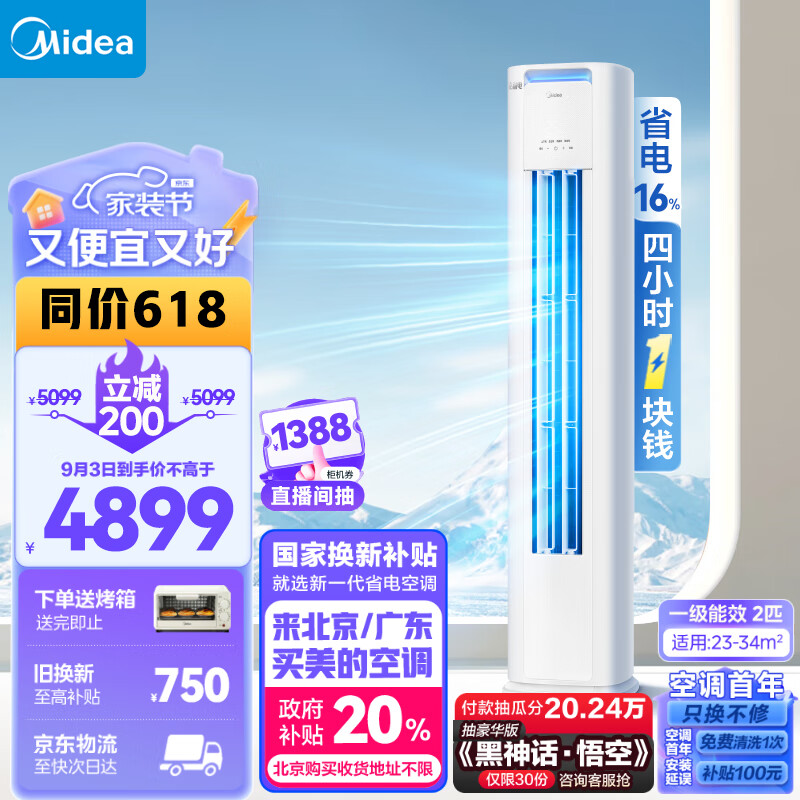 美的(Midea)空调 2匹 酷省电 新一级能效 变频冷暖 空调立式 客厅空调柜机 云朵系列 KFR-51LW/N8KS1-1P价格:4899.00元!