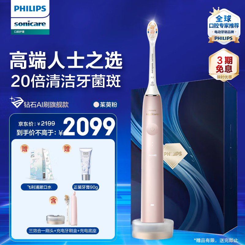 飞利浦(PHILIPS)电动牙刷 情侣款送男/女友 中秋节教师节 含充电旅行盒20倍清除牙菌斑钻石AI刷旗舰款茱萸粉HX9996价格:2199.00元!