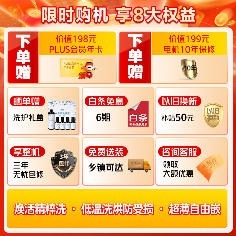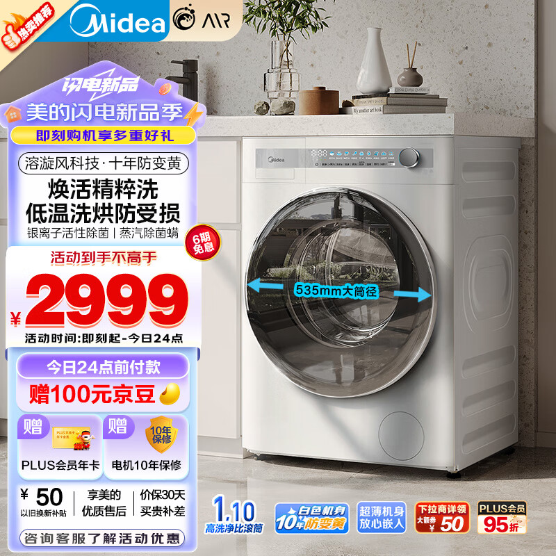 美的(Midea)滚筒洗衣机全自动家用 MD100AIR1 10公斤洗烘一体超薄自由嵌 AIR系列 焕活精粹洗 低温烘 云朵系列价格:2831.00元!