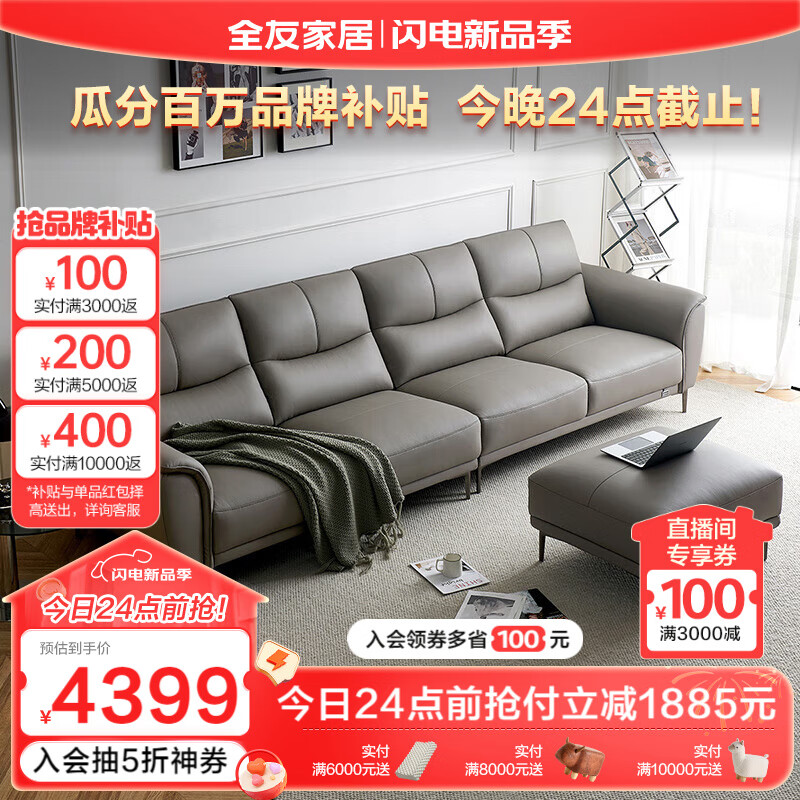 全友家居 直排式真皮沙发客厅现代简约头层牛皮一字皮艺沙发112011价格:6284.29元!