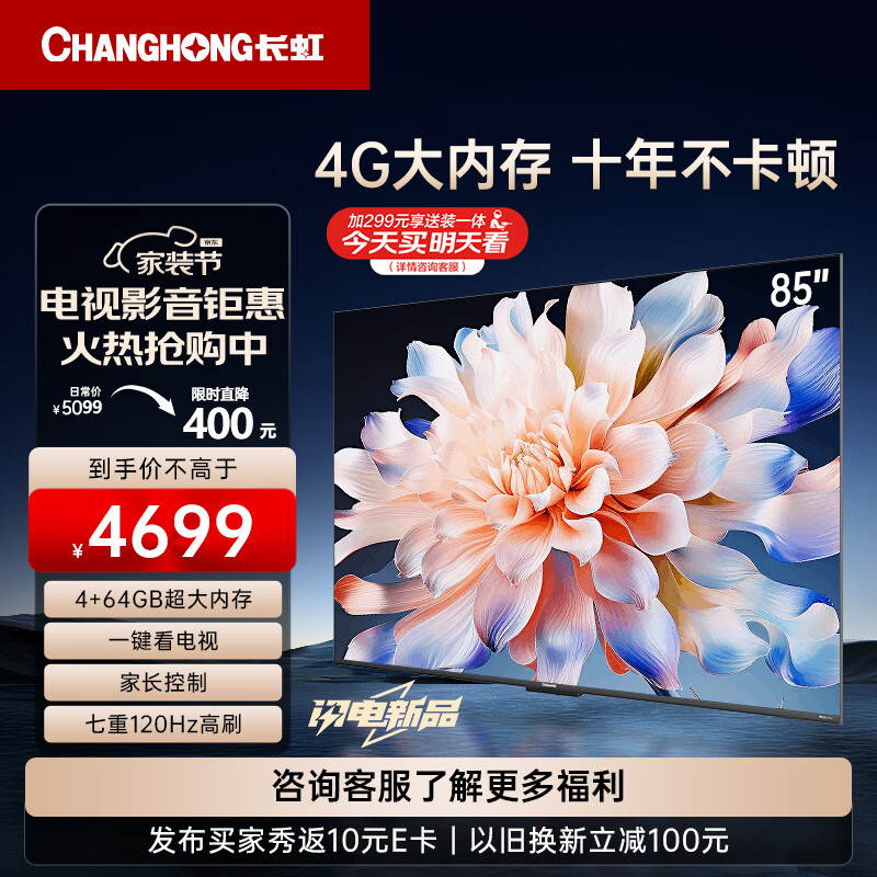 长虹电视85D66F 85英寸4K超高清 4+64GB超大内存 一键看电视 120Hz高刷新液晶电视机 以旧换新价格:4849.00元!
