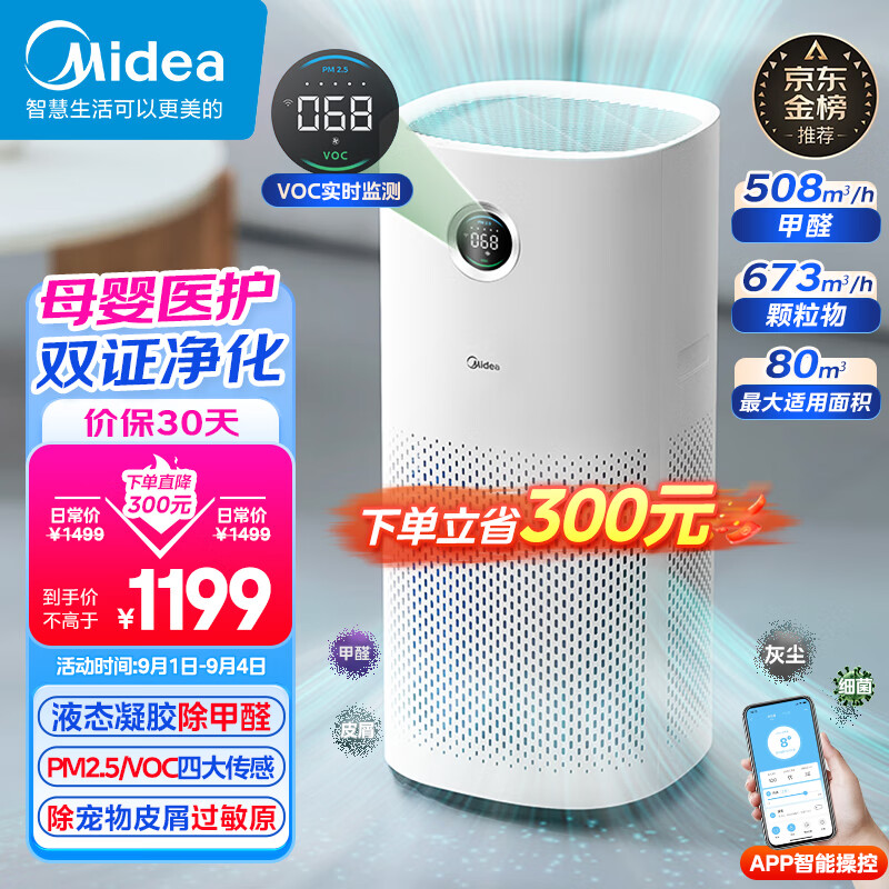 美的(Midea)医用母婴空气净化器除甲醛异味吸烟宠物猫毛过敏源空气消毒机滤芯新风机含甲醛检测KJ600G-RX600价格:1499.00元!