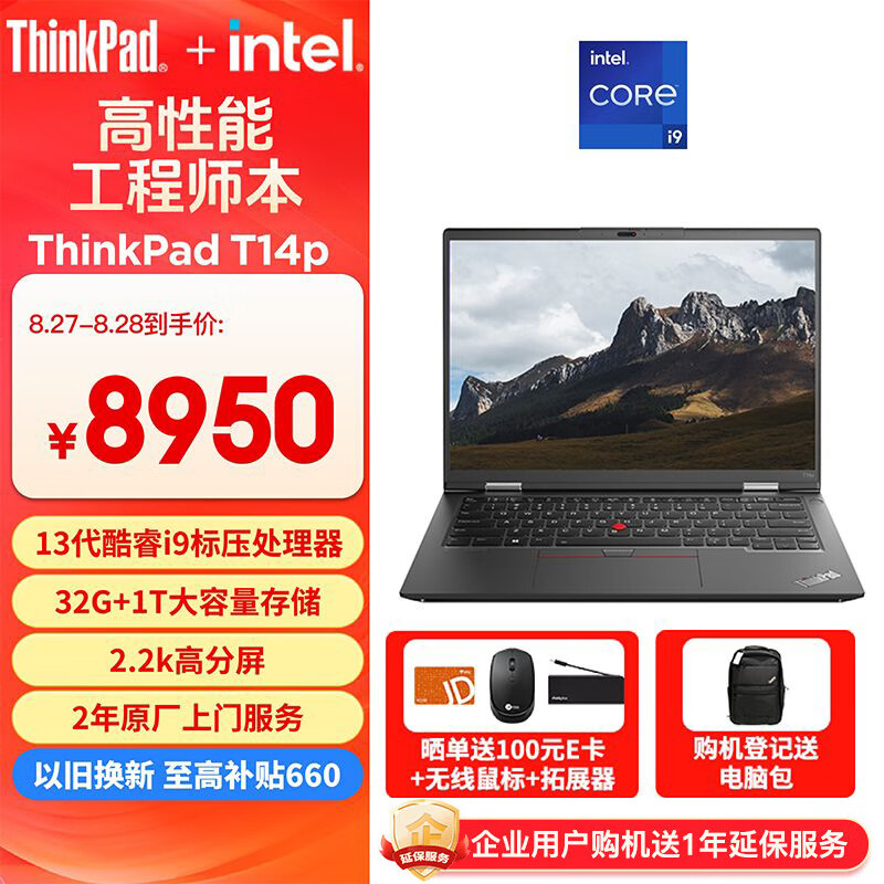 ThinkPad T14p 联想14英寸高性能标压工程师本笔记本电脑 13代酷睿i9-13900H 32G 1TB 2.2K 商务办公本价格:8950.00元!