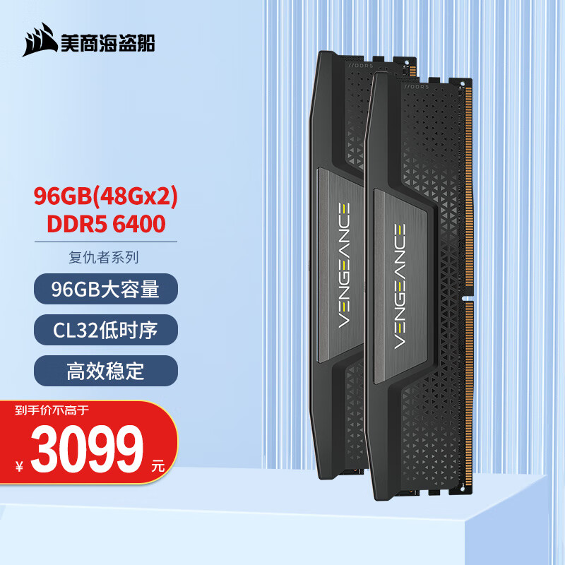 美商海盗船(USCORSAIR) 96GB(48G×2)套装 DDR5 6400 台式机内存条 复仇者系列 游戏型 黑色 CL32价格:3099.00元!